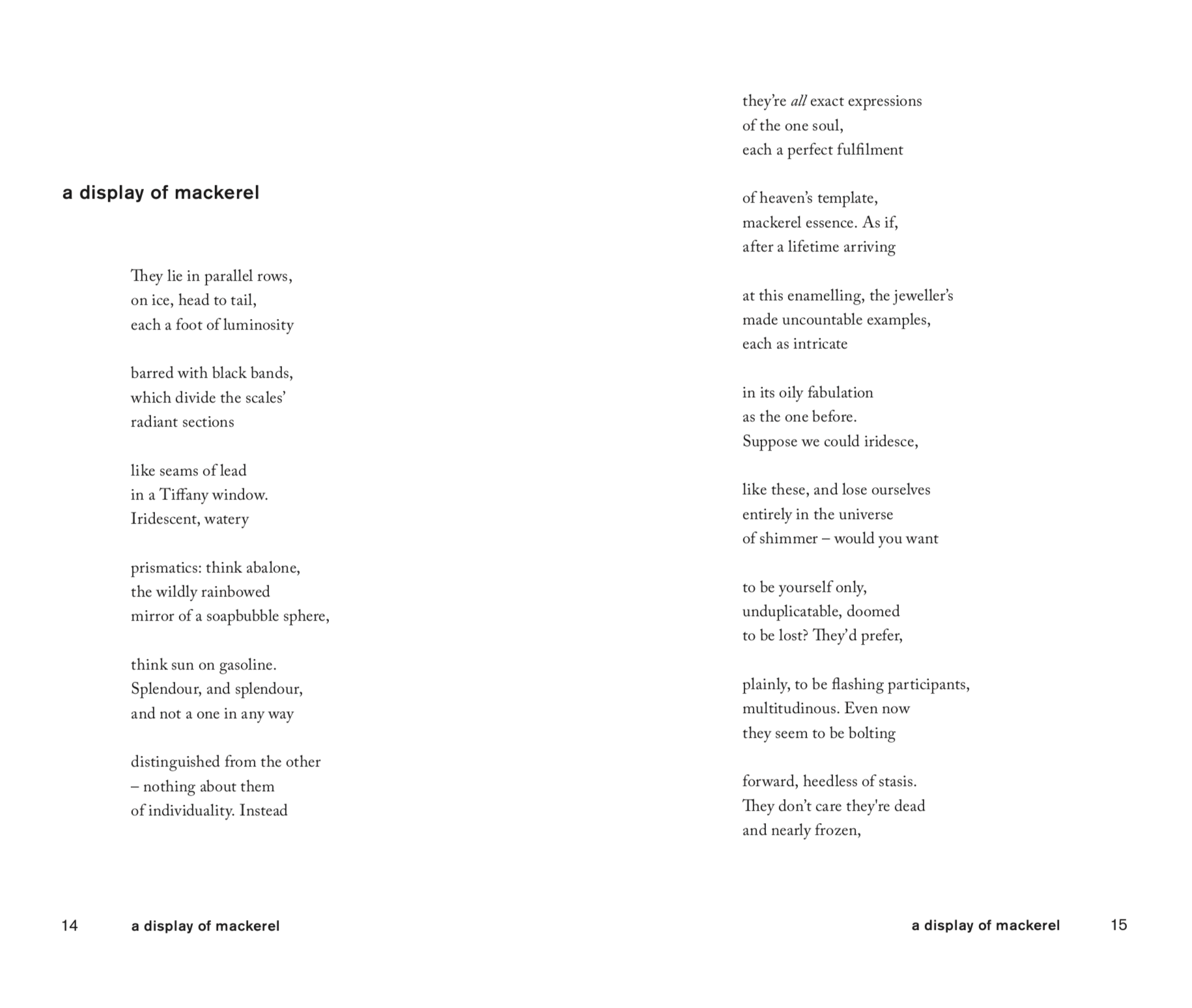 The clear and unfussy nature of Akzidenz Grotesk, paired with Caslon for the body, makes for an interesting contrast on the page – clearly delineating the poem itself from any navigational text. Generous margins and spacing keep the page uncluttered and fresh, ensuring the focus is kept on the poem – particularly useful if the book is needed for a live reading.
